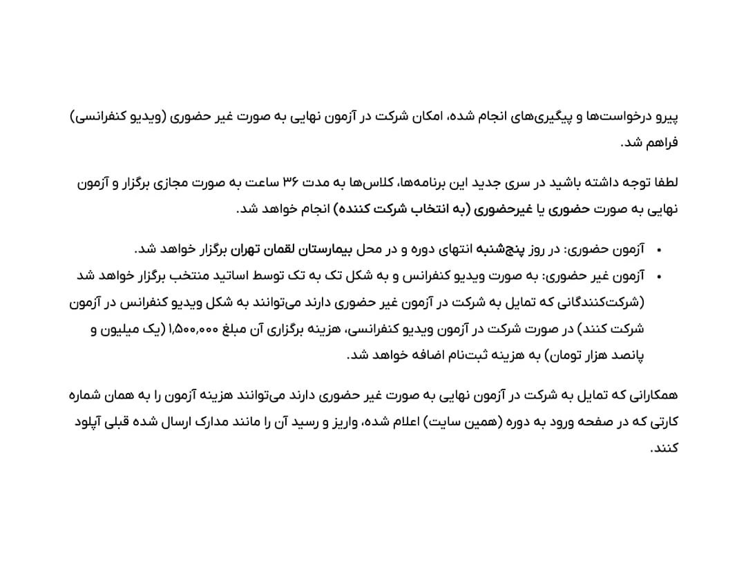لطفا توجه داشته باشید در سری جدید این برنامهها، کلاسها به مدت ۳۶ ساعت به صورت مجازی برگزار و آزمون نهایی به صورت حضوری یا غیرحضوری (به انتخاب شرکت کننده) انجام خواهد شد.